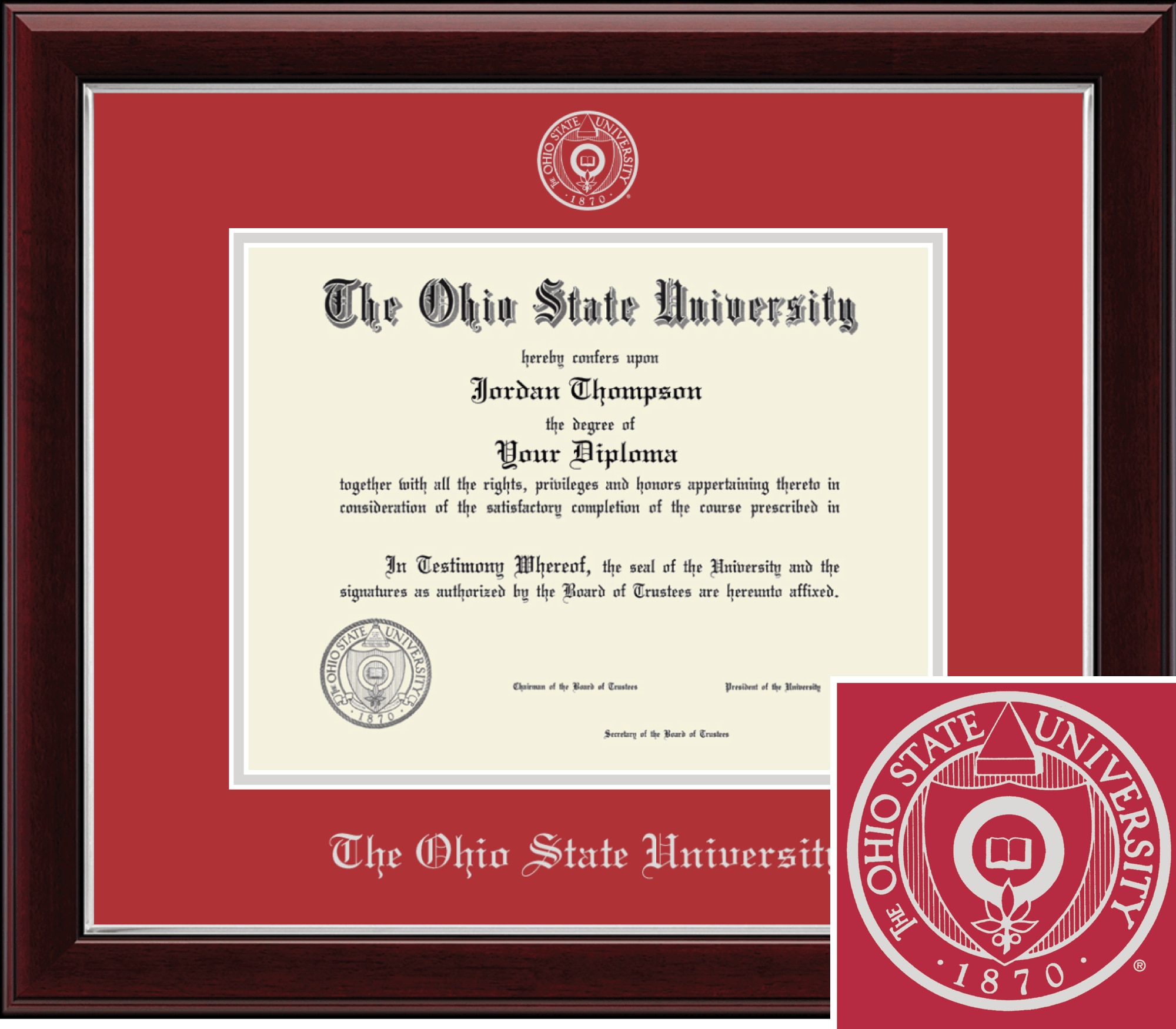 This USA made frame features an embossed The Ohio State University seal and school name on Red and Silver mats. Framed in Gallery Silver moulding with a Cherry finish and inner silver lip. Approx. Overall Size 16.5" x 19".